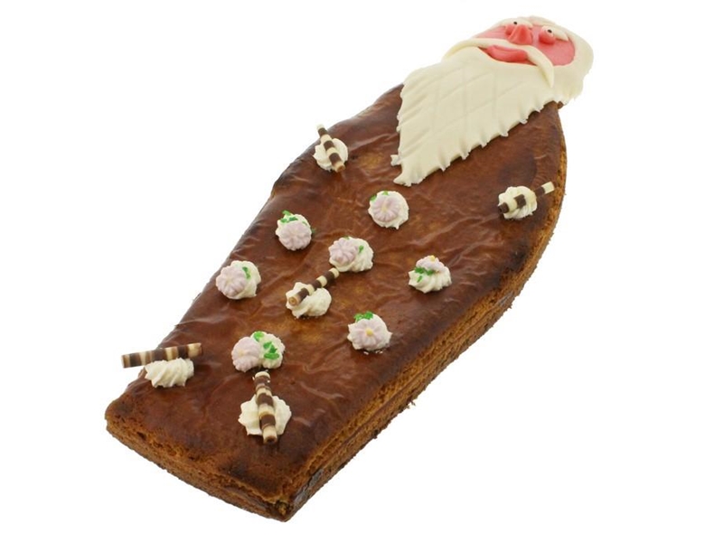 Boterkoek gevuld met 100% zuivere amandelspijs in de vorm van een oude man. De koek is opgemaakt met creme, suikerbloempjes en chocolaatjes. Het hoofd is van marsepein. De pop is verpakt in een feestelijke cadeauverpakking, inclusief oorkonde en beeldje.