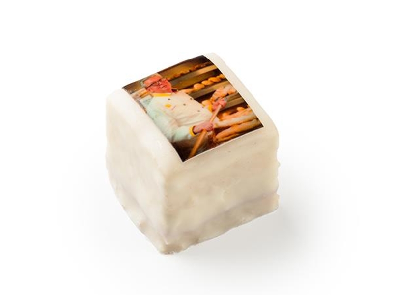 Cake gebakje met een vulling van crème, laagje frambozen en marsepein, gedompeld in een crème dip. Een gebakje met uw eigen afbeelding erop geeft een persoonlijk tintje aan iedere gelegenheid. Denk aan een foto van de jarige, het bruidspaar of het logo van uw bedrijf/relatie, het is allemaal mogelijk!