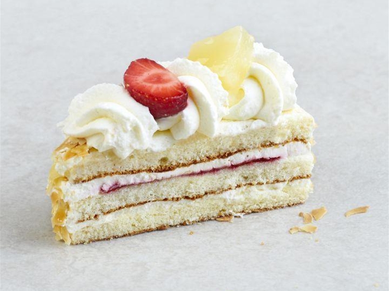 Cake gevuld met slagroom en een laagje frambozen-bessenmoes en aangezet met amandelschaafsel.