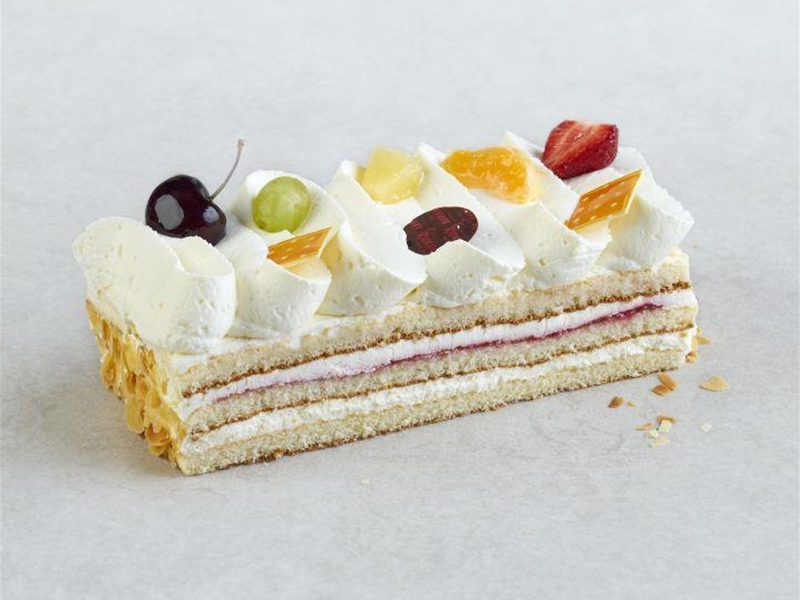 Cake gevuld met slagroom en een laagje frambozen-bessenmoes en aangezet met amandelschaafsel.