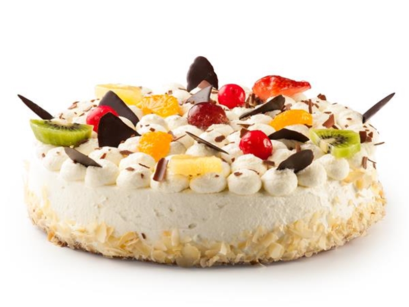 Cake gevuld met slagroom en een laagje frambozen-bessenmoes en aangezet met amandelschaafsel.De taart wordt feestelijk gedecoreerd met slagroom, verse vruchtjes of snoepjes naar keuze en kinderversiering. Dat wordt een feest!!!