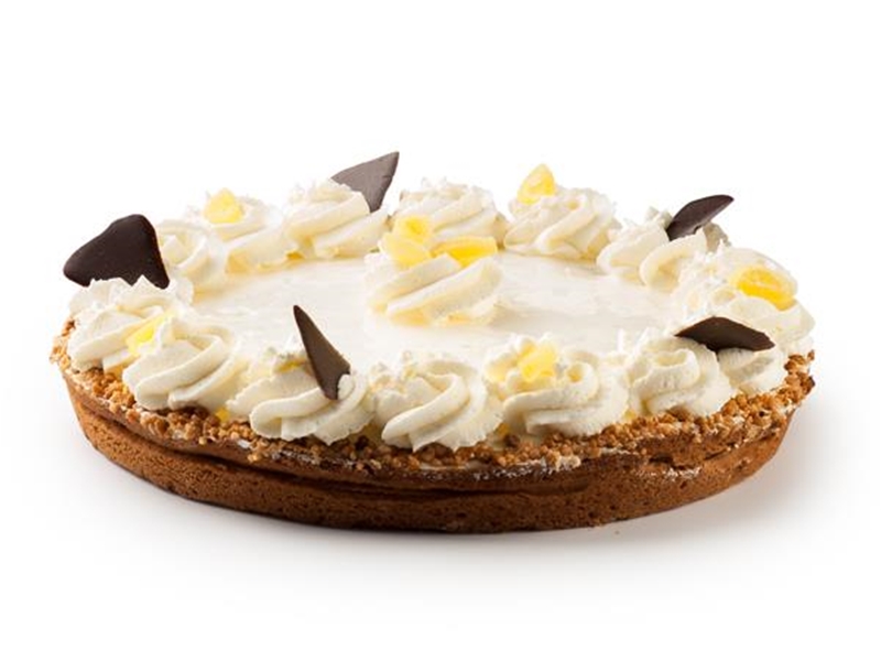 Luxe zanddeegbodem gevuld met echte banketbakkersroom en een laagje appel- en citroenbavaroise. Afgewerkt met verse slagroomrozetten en gekonfijte citroenpartjes.