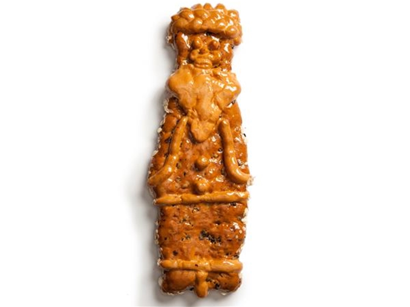 Origineel cadeau wanneer iemand Abraham gaat zien. Rijkelijk gevuld krenten- en rozijnbrood gevuld met roomboter amandelspijs, in de vorm van een abraham.