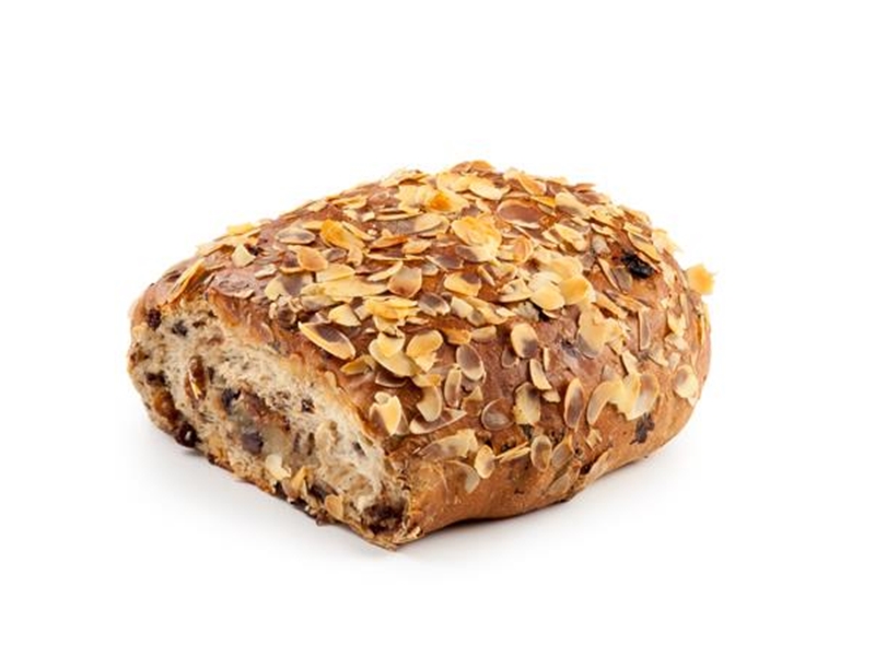 Dit luxe krenten- en rozijnenbrood deeg is gevuld met roomboter amandelspijs en afgewerkt met amandelschaafsel.