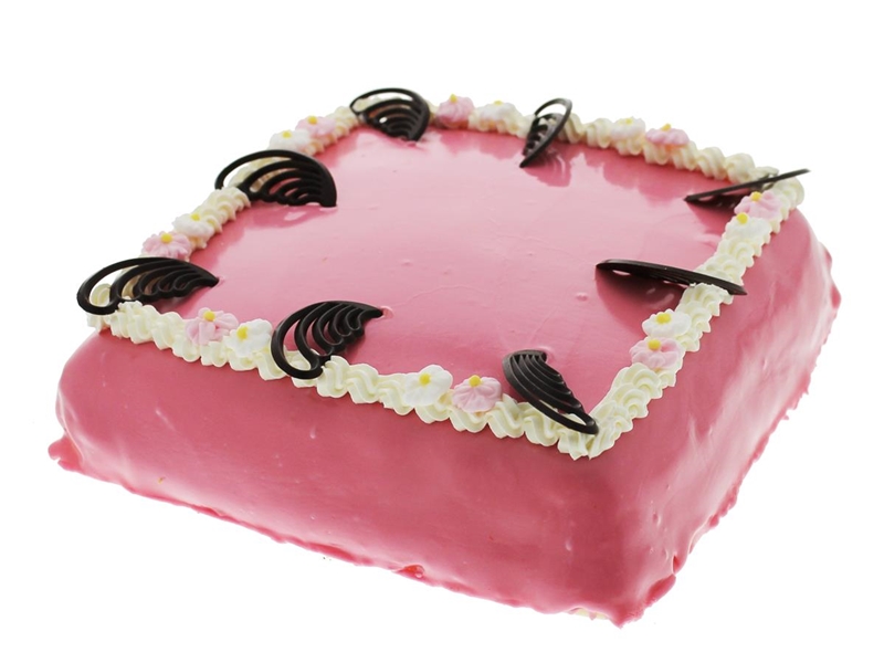 Een smeuïge bodem royaal gevuld met chipolata (slagroom,gele room en vruchtjes). De taart is geheel bedekt met marsepein en roze fondant en is afgemaakt met vanillecreme, suikerbloempjes, en chocolaatjes. Maak je taart compleet met een persoonlijke tekst of afbeelding. Dit wordt met eetbare inkt & eetbaar papier met marsepein op de taart gelegd. Of maak de taart extra feestelijk met onze vrolijke kinderversiering. Bestel ook direct de kaarsjes bij de taart, dan is het feestje echt compleet!