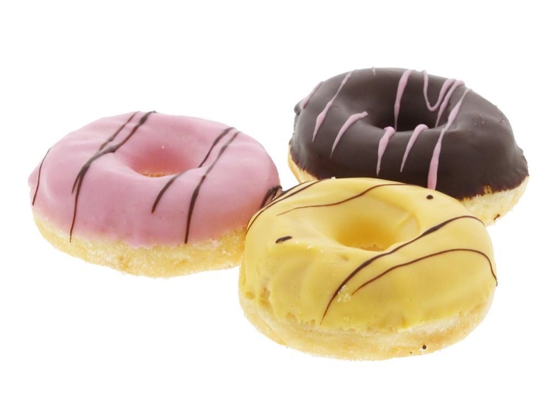 Een donut is een zoet gefrituurd broodje met een gat in het midden. De mini donuts assorti bestaat uit 3 varianten wit, geel en rose. Allen afgewerkt met streepjes chocolade.