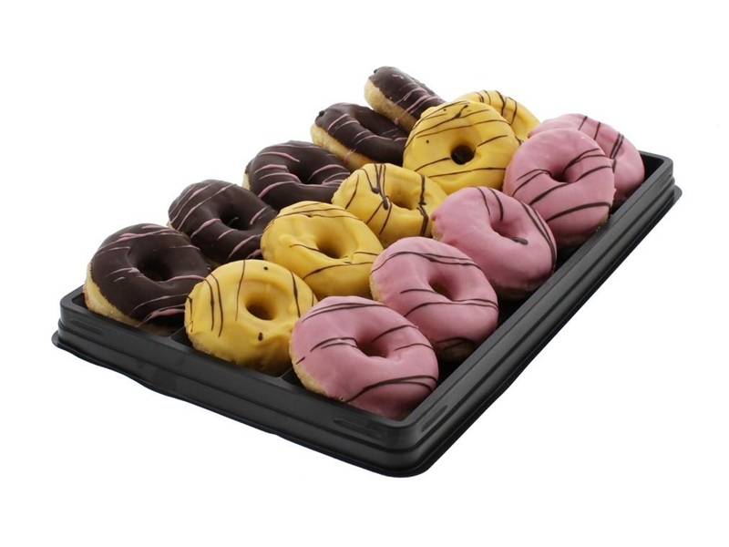 Een donut is een zoet gefrituurd broodje met een gat in het midden. De mini donuts assorti bestaat uit 3 varianten wit, geel en rose. Allen afgewerkt met streepjes chocolade. Verpakt in een handige uitdeelbox.